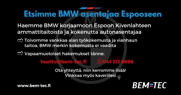 Haemme nyt joukkoomme vakituiseen työsuhteeseen ammattitaitoista ja kokenutta BMW autonasentajaa meidän täyden palvelun korjaamoon Espooseen. Toivomme sinulta vankkaa alan työkokemusta monipuolisista huolto- ja korjaustehtävistä, vianhaku taitoa. Aiempaa BMW merkin kokemusta ei vaadita.